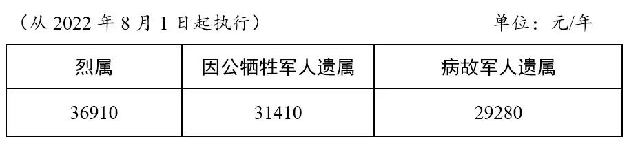 烈属、因公牺牲军人遗属、病故军人遗属定期抚恤金标准表
