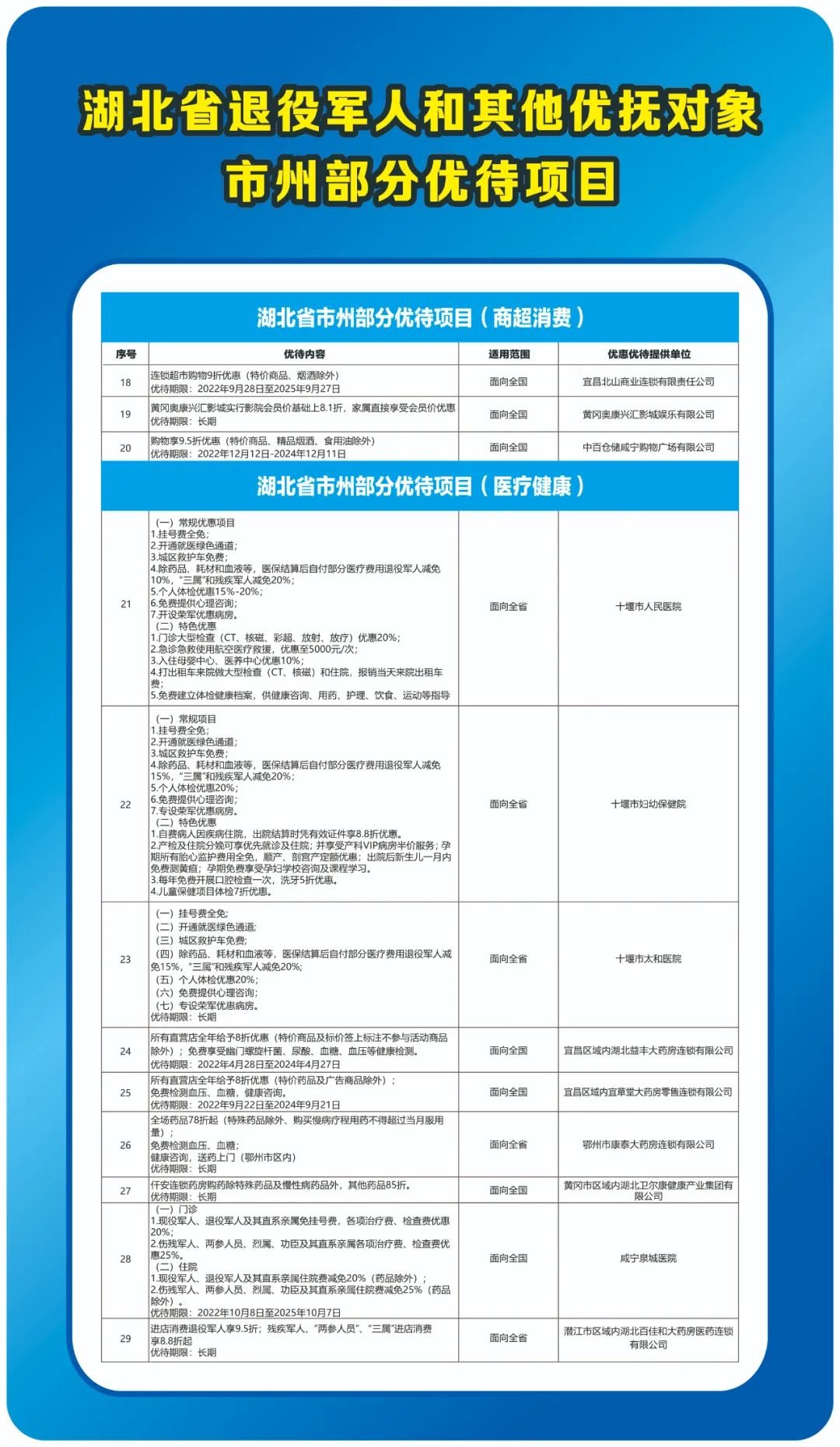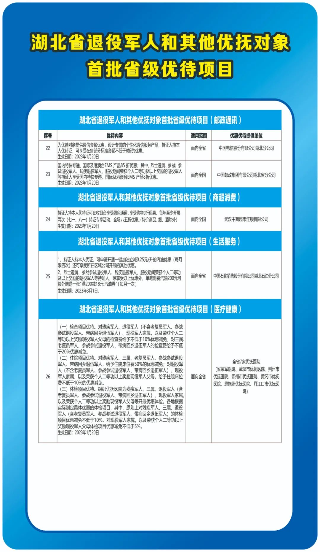 在发布仪式优待项目现场签约环节,湖北省博彩365bet网址导航_正规365没有黑钱_365500元大写事务厅与中石化湖北石油分公司、中国电信湖北分公司、中国邮政湖北分公司、湖北文化旅游集团有限公司、武汉中商超市连锁有限公司、武汉融通中南花园酒店有限责任公司6家单位签订拥军优抚合作协议,推出全省首批省级优待项目。现场还发布了各市州部分优待项目,涵盖文化旅游、餐饮住宿、商超消费、医疗健康等领域。
